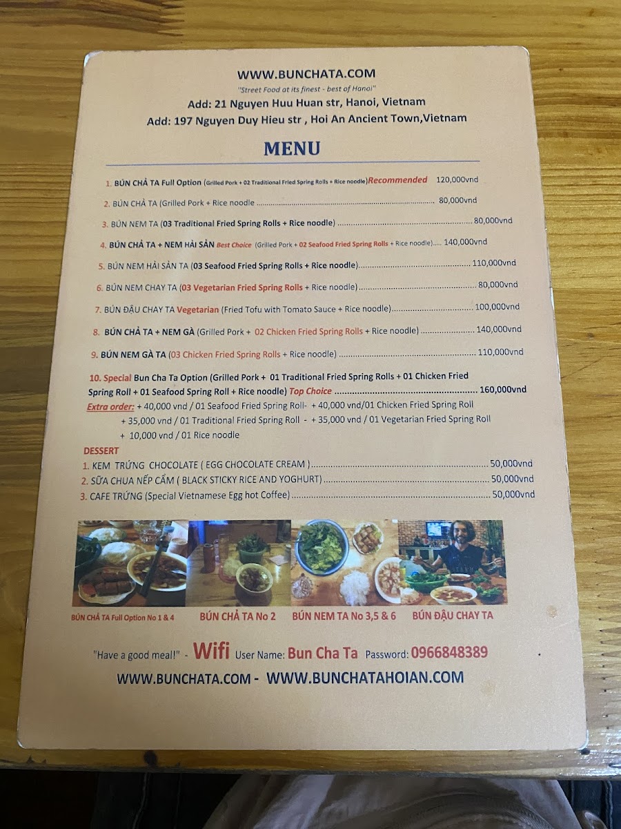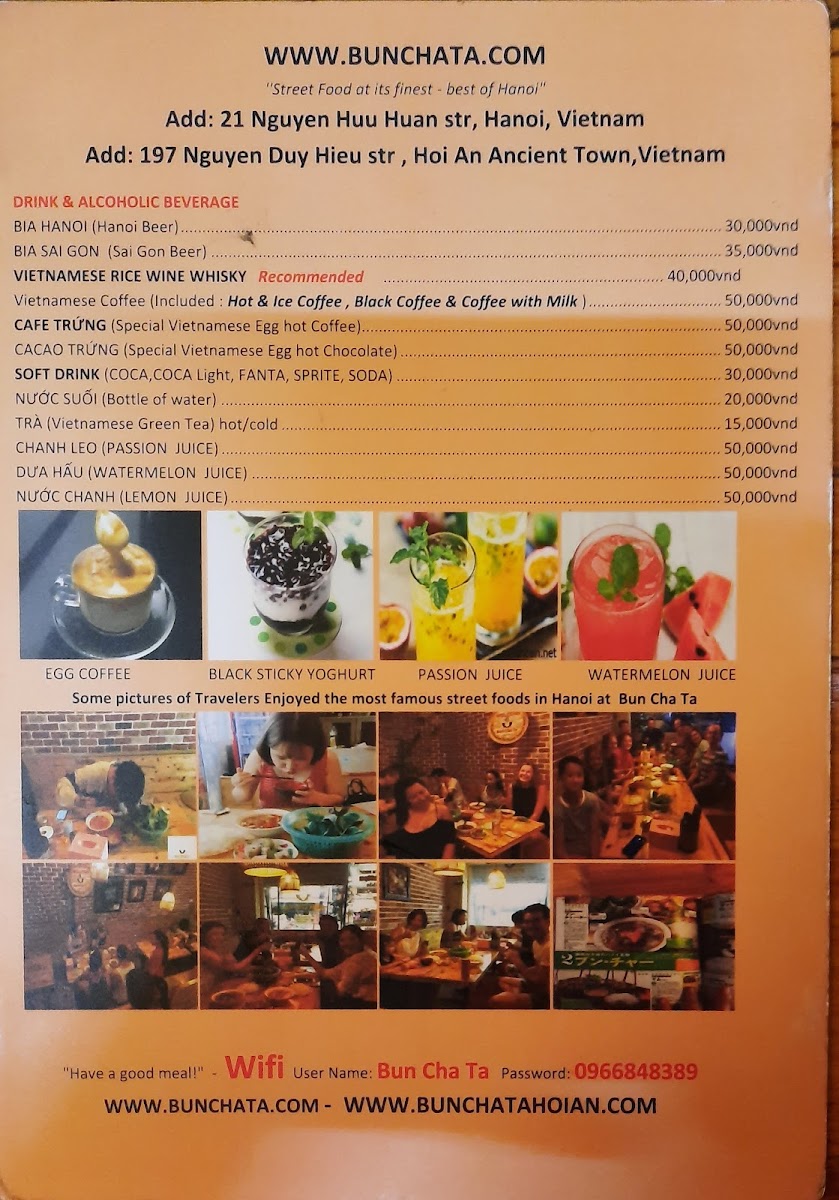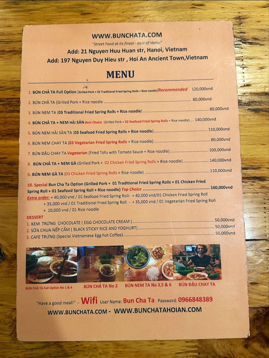“ Bun Cha Ta was the first meal we had in Vietnam and it was divine! The bun cha set comes with noodles, braised pork and broth, greens and spring roll - really hearty! And simply delicious! Also tried the egg coffee which was yum, and passion fruit juice which was on the sweeter side. Very nice staff too. We sat downstairs, but they have ample seating upstairs - thought it looked a bit dark. Overall would totally recommend! ”
